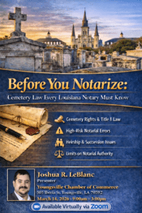 Louisiana Cemetery Law Every Notary Must KnowJoin us for an in-person and online event. Notaries will learn the importance of Louisiana Cemetery law such as:
